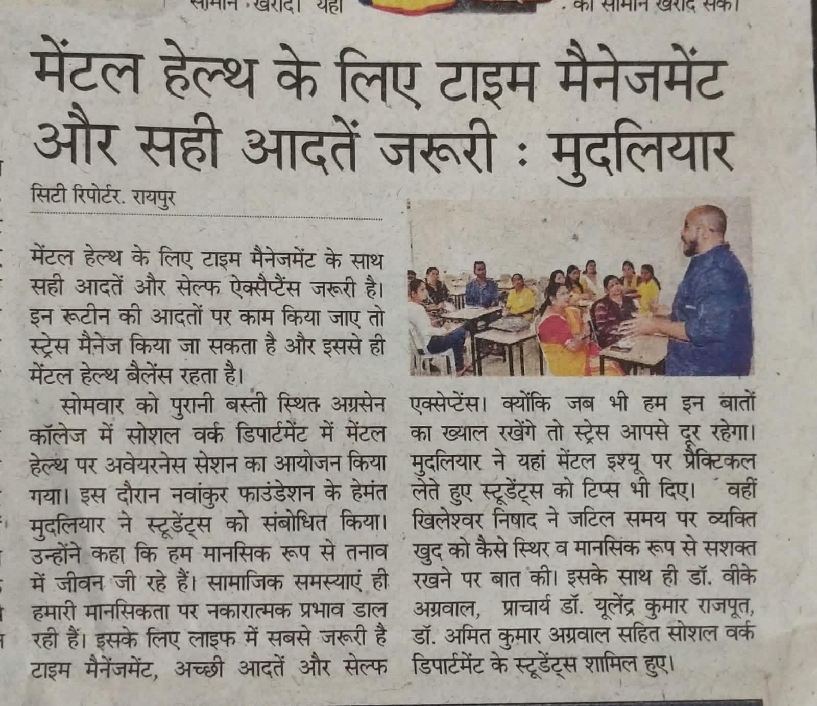 समाज कार्य विभाग अग्रसेन महाविद्यालय मानसिक स्वास्थ्य विषय पर जागरूकता पर कार्यक्रम